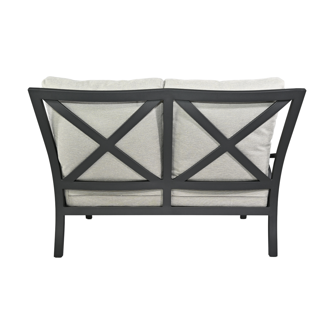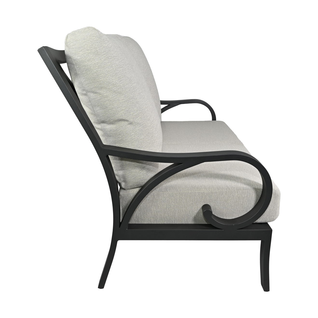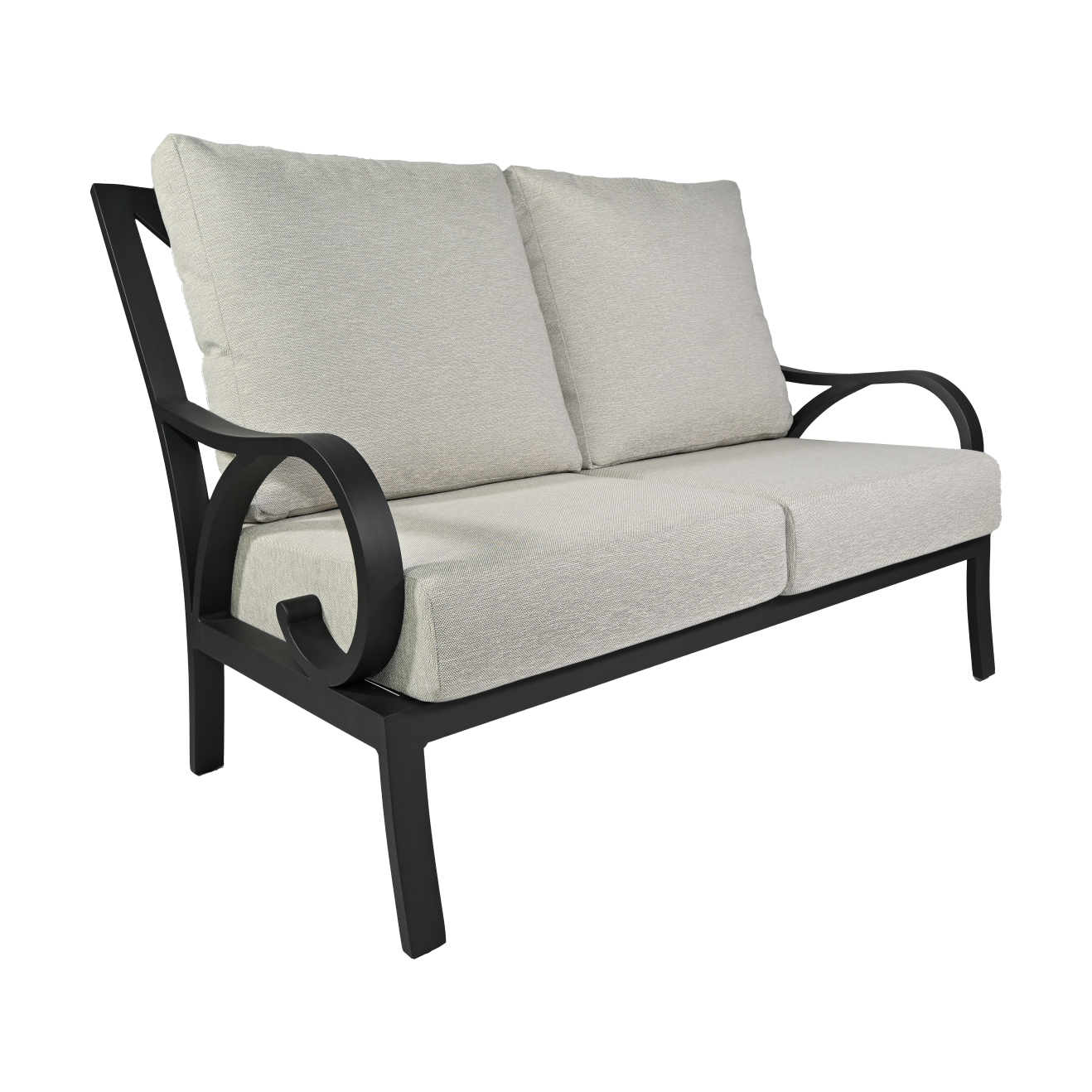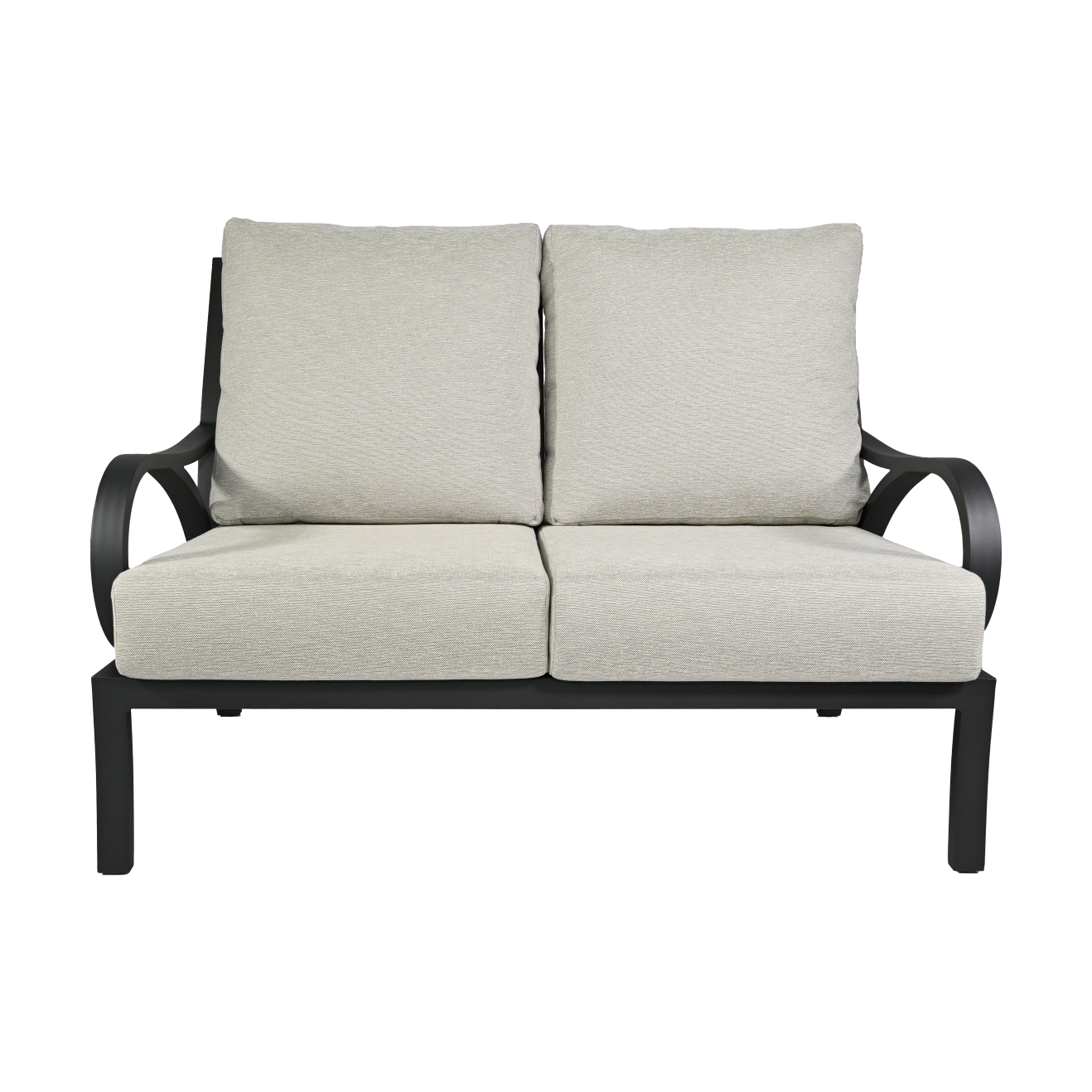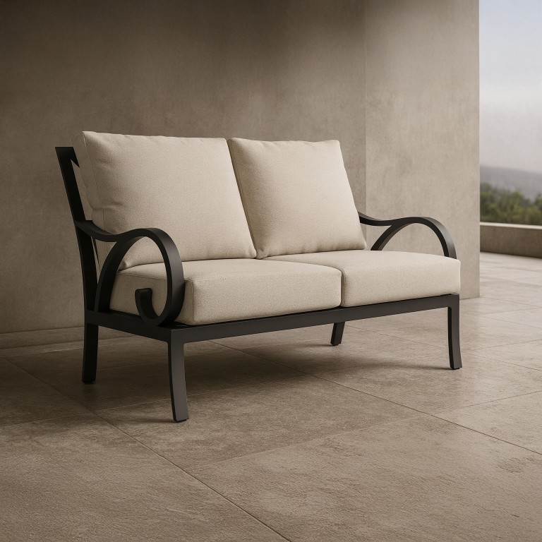 The Cape Coral Love Seat offers intimate seating for two with its transitional design. The deep Tiger Charcoal aluminum frame creates a cozy yet sophisticated spot, perfect for outdoor relaxation.