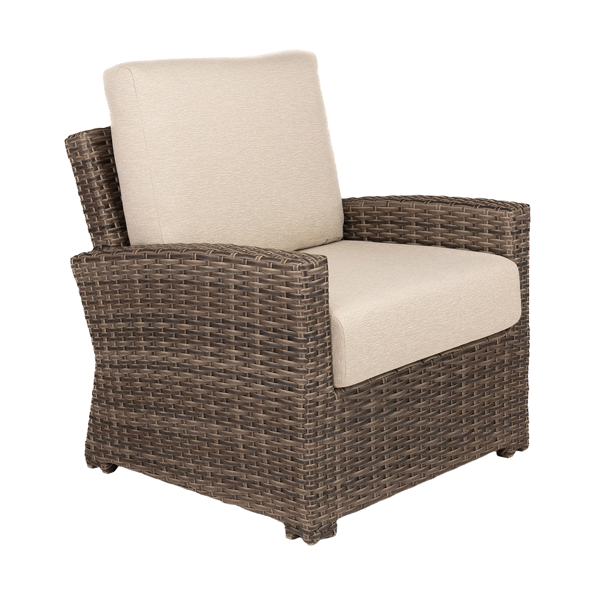 The Captiva Lounge Chair offers timeless elegance with its traditional mid-back design. Crafted from durable, weatherproof synthetic resin wicker, it features a 12mm textured weave in warm, earthy tones. Paired with UV-protected waterproof cushions, this chair provides both style and comfort for relaxing outdoors.