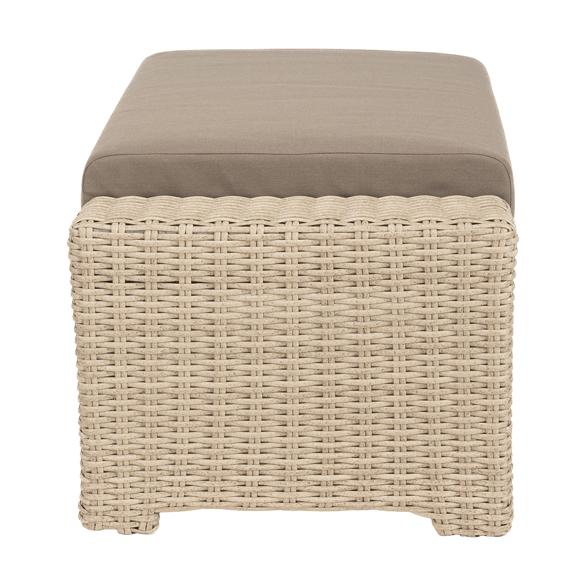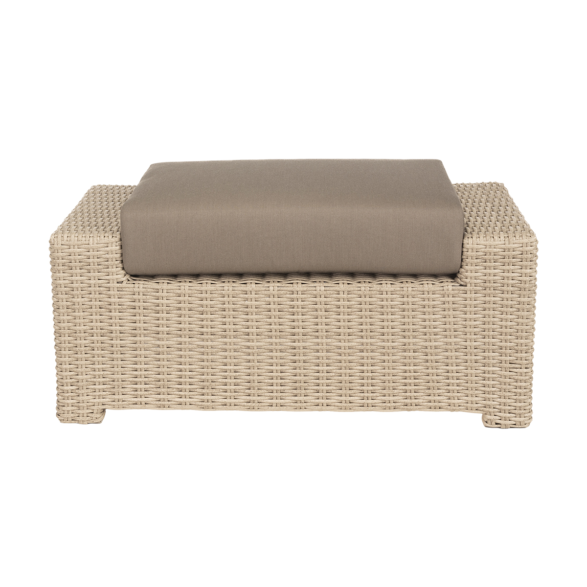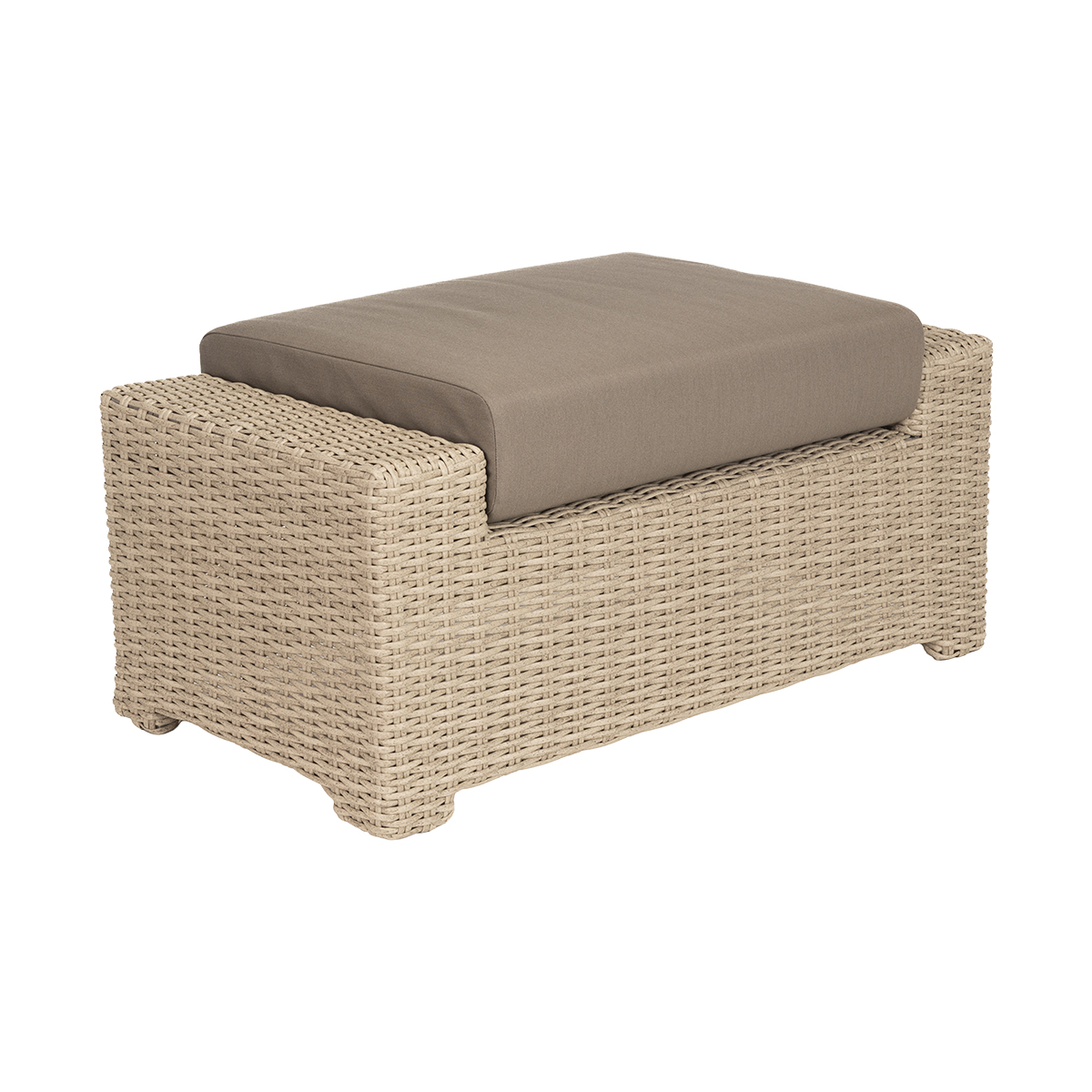 The Sanibel Ottoman is a versatile addition to your outdoor setup. Whether used as a footrest or extra seating, its durable round resin wicker construction makes it both functional and stylish. The UV-protected cushion ensures comfort and weather-proof.